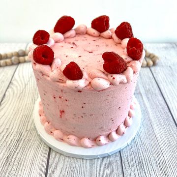 Fresh raspberries are added to this vanilla bean cake then it is layered with raspberry cheesecake and frosted with raspberry buttercream. A fresh berry garnish finishes this beauty. 6" shown feeding 8-10