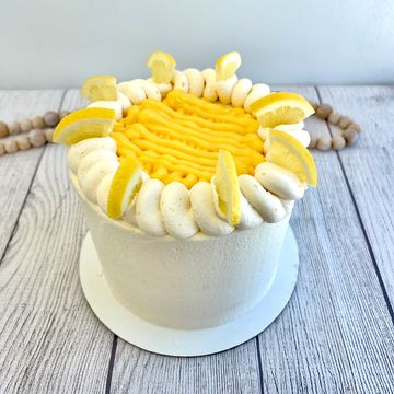 Fresh lemon cake is layered with vanilla mousse and lemon curd, then frosted with vanilla bean buttercream and drizzled with lemon curd. 6" feeding 8-10 shown.